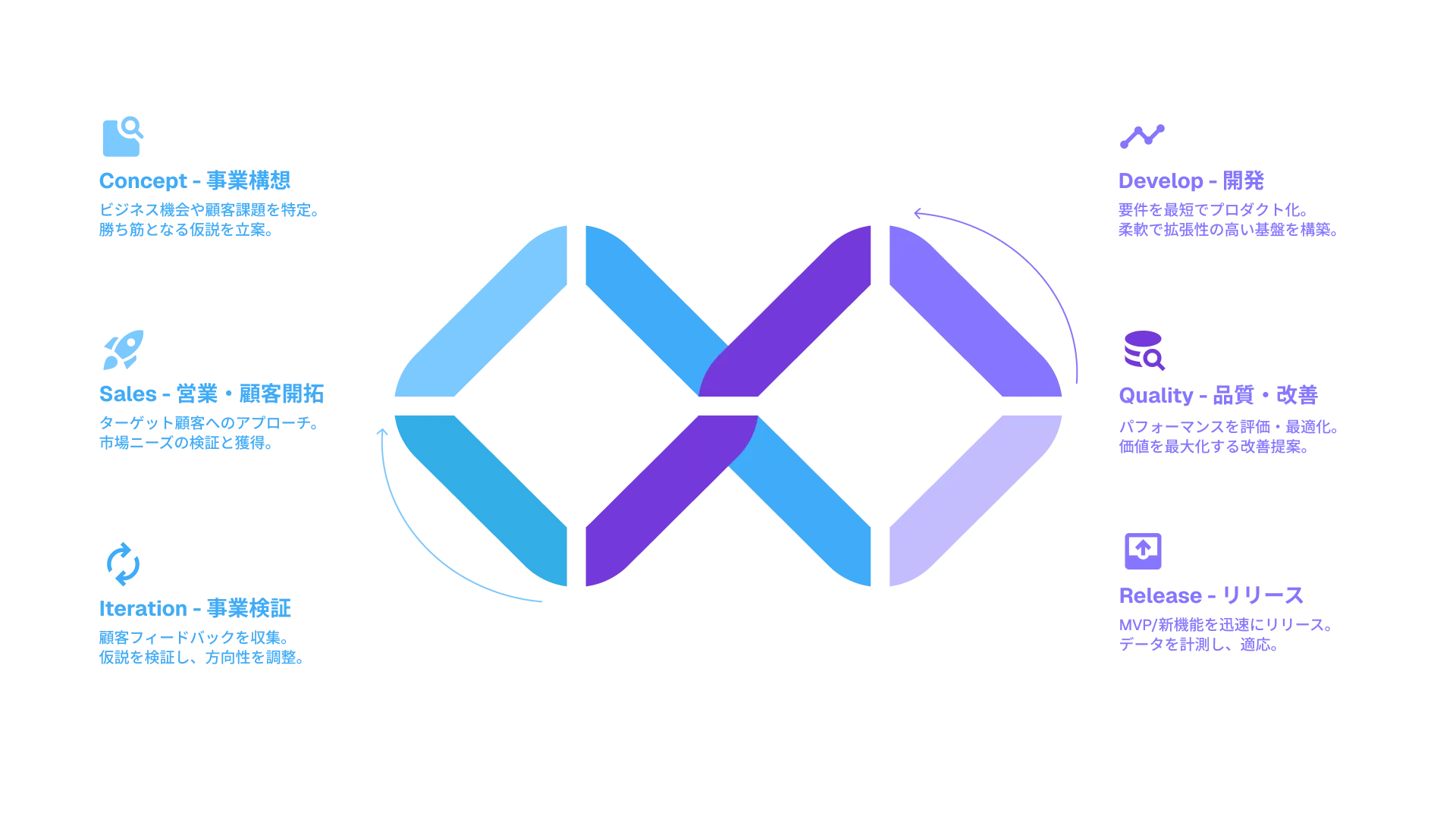 アイデアだけでは、事業は立ち上がらない。人材だけでも、成長は再現できない。私たちは、事業検証・開発・組織運営を「仕組み」として設計し、持続的に成果を出し続ける仕組みを築きます。